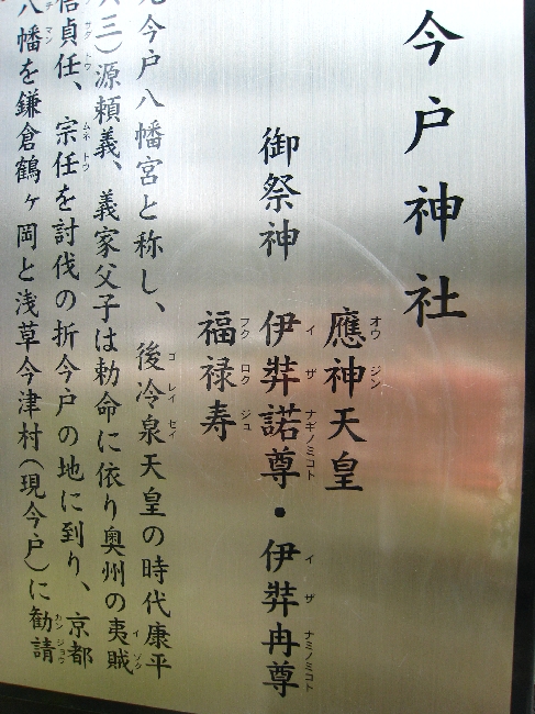後冷泉天皇康平六年(1063年)、源頼義・義家父子が、勅令によって奥州の夷賊安部貞任・宗任の討伐の折、鎌倉の鶴ヶ岡と浅草今之津(現在の今戸)とに京都の石清水八幡を勧請したのが今戸八幡(現在の今戸神社)の創建とされてます。石清水八幡の御祭神は中御前 に誉田別命(第15代応神天皇)・西御前に比咩大神(宗像三女神)・東御前 に息長帯姫命(おきながたらしひめのみこと・神功皇后)を祀っています。